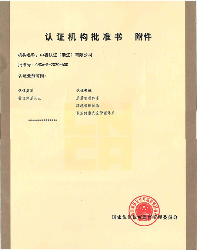 中睿認證(浙江)有限公司正式獲得中國國家認證認可監督管理委員會批準,批準號:CNCA-R-2020-600,正式成為可以從事ISO9001,ISO14001,ISO45001的認證機構,公司致力于為企業提供增值審核服務。